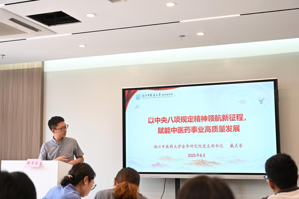 近日,浙江中医药大学金华研究院党支部召开专题党课学习会,支部书记戴灵豪以“以中央八项规定精神领航新征程,赋能中医药事业高质量发展”为主题,为全体党员讲授党课。