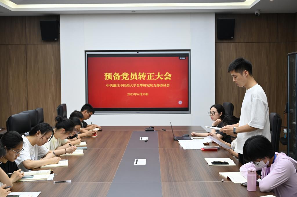 6月30日,中共浙江中医药大学金华研究院党支部在E2-b实验楼一楼会议室召开预备党员转正大会。